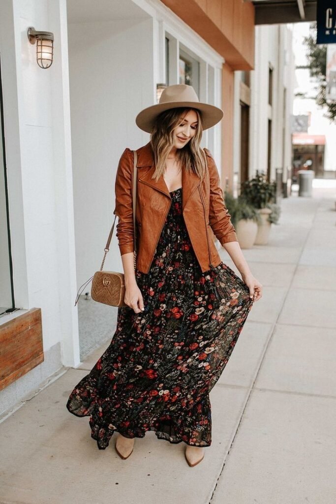 Show your free-spirited side in a flowing floral maxi dress with earthy tones, ideal for casual birthday outfit ideas. Pair with brown suede ankle boots for practicality and style. A wide-brimmed hat adds extra boho flair for outdoor celebrations. This outfit is perfect for garden parties, picnics, or daytime birthday events. The combination balances comfort with a playful, trendy aesthetic.