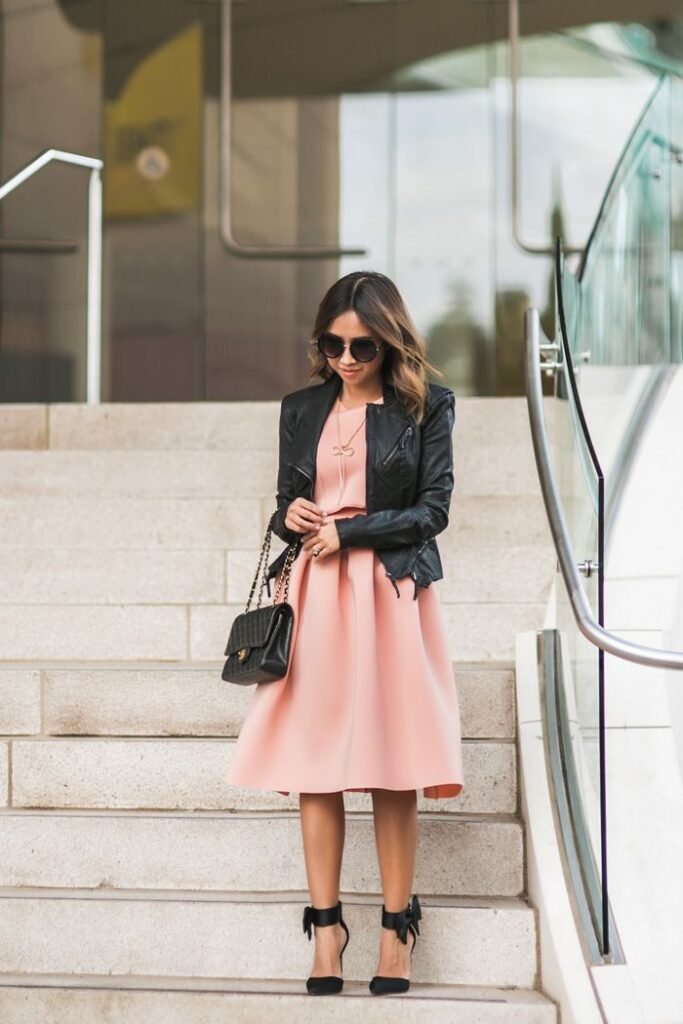 Channel boss-lady vibes with a tailored pastel pink blazer and matching trousers, a top birthday outfit idea for sophistication. Layer a white silk camisole for softness and elegance. Delicate gold jewelry adds subtle shine without overpowering the ensemble. This look works beautifully for a birthday dinner at a chic restaurant. It’s perfect for women seeking stylish birthday looks that are polished yet modern.